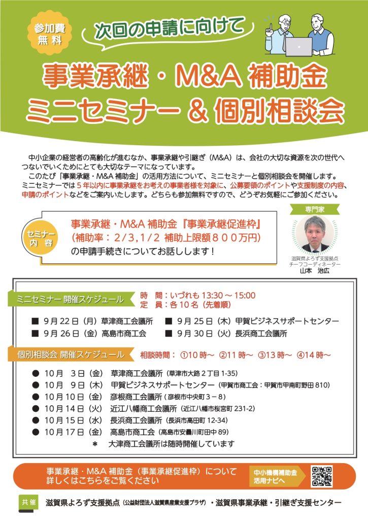 事業承継・M&A補助金 ミニセミナー&個別相談会 開催のお知らせ【9/22~10/17】(終了致しました)